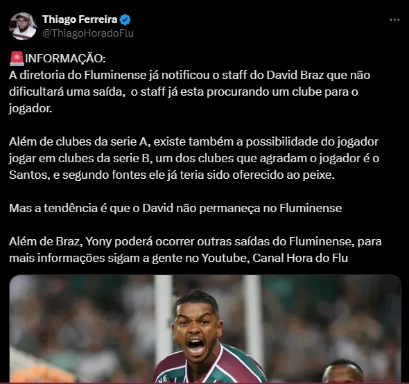 De acordo com o youtuber Thiago Ferreira, do canal Hora do Flu, David Braz não faz parte dos planos do Fluminense. Seu staff, inclusive, já foi comunicado pela diretoria e começou a buscar novos clubes.