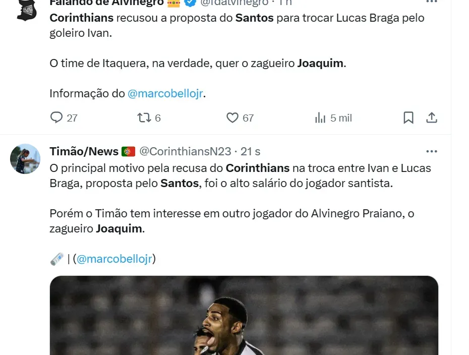 Santos e Corinthians enfrentam dificuldades para chegar a um acordo em uma troca envolvendo o atacante Lucas Braga e o goleiro Ivan. O clube do Parque São Jorge recusou pelos altos vencimentos do atacante – que ganha R$ 250 mil por mês.