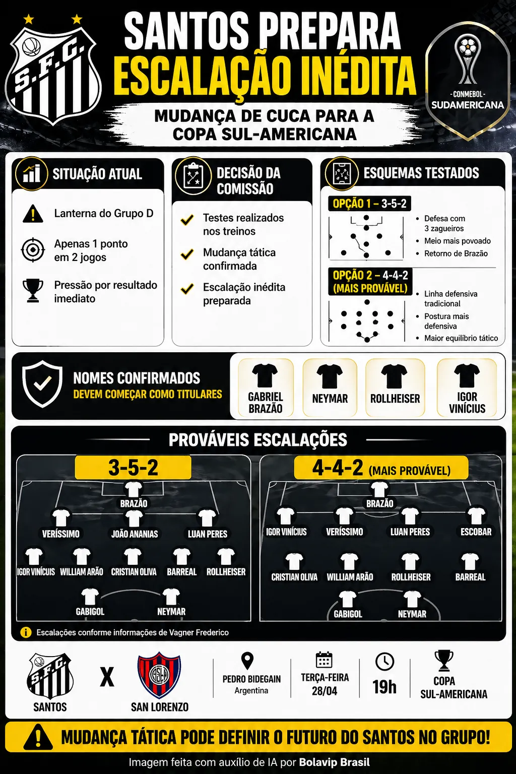 Vai ser uma escalação inédita, o Santos nunca utilizou essa escalação. Existem duas possibilidades, a primeira delas em um 3-5-2, com o retorno de Brazão, que é um dos cinco jogadores juntos com Neymar, Gabigol, William Arão e Igor Vinicius, dos cinco jogadores que não foram para a Bahia”.