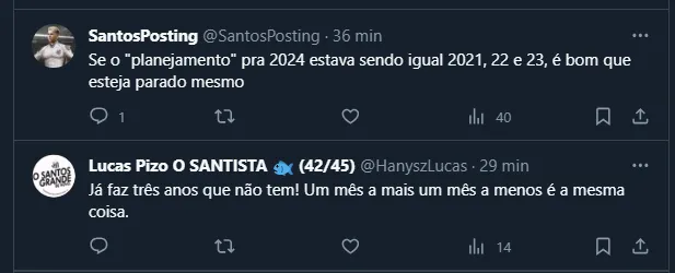 Vale lembrar que, por mais que ainda lute para ter um calendário mais cheio em 2024, o torcedor do Santos ainda vê muitas indefinições internas. Por conta da eleição, que acontecerá no dia 9 de dezembro, o planejamento foi “adiado”.