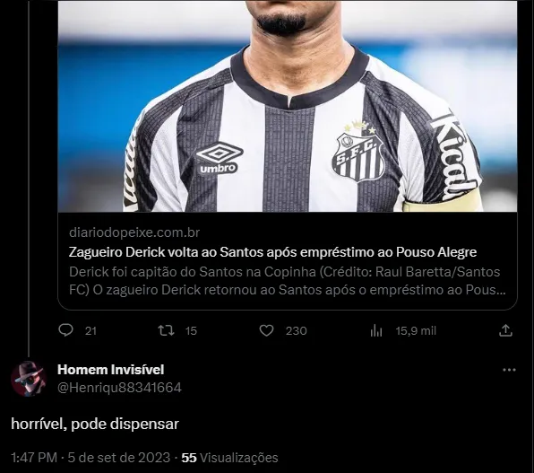 Trata-se do zagueiro Derick, cria da base do Santos, mas que estava emprestado ao Pouso Alegre, de Minas Gerais. O time mineiro foi eliminado da Série C do Campeonato Brasileiro, portanto, o defensor voltou ao Peixe e se recupera de uma lesão no CT Rei Pelé, de acordo com o portal Diário do Peixe.