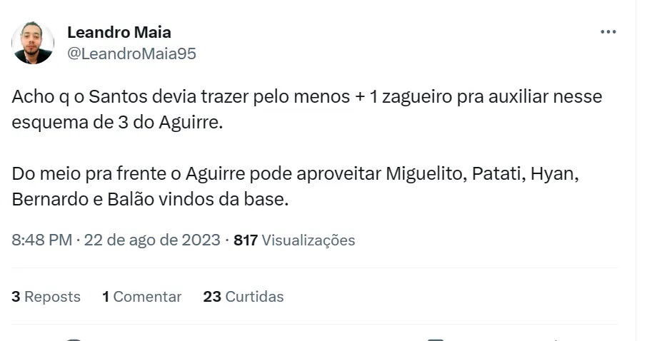 O Bolavip Brasil apurou que há 2 jogadores que vão ganhando espaço no elenco aos poucos: o atacante Weslley Patati e o lateral-direito Júnior Caiçara, último reforço do Peixe no momento. Os dois vêm tendo destaque e podem ganhar chance no time de Aguirre. O LD tem maior probabilidade pela carência na função. João Lucas é alvo de críticas.