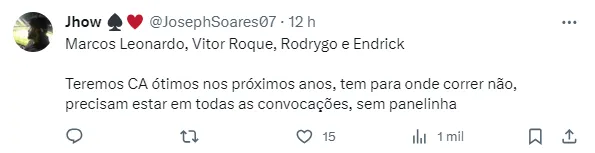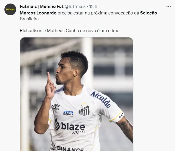 “Estou trabalhando para isso, é dos meus principais objetivos vestir a 9 do Brasil jogando pelo Santos. Fico feliz, se Deus quiser logo logo eu possa estar na Seleção principal”, concluiu ele. A expectativa pela convocação de Marcos ganha ainda mais força pelo momento ruim que os atacantes convocados para a seleção vêm tendo com a amarelinha.