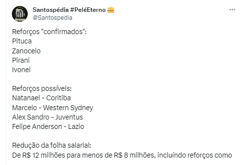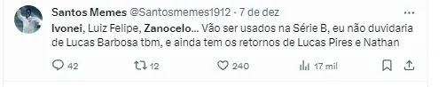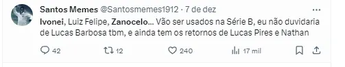 Agora, no que diz respeito ao elenco santista para o ano que vem, de acordo com informações publicadas no site Uol Esporte, um grupo de seis jogadores está voltando ao Santos para 2024. Tratam-se de Zanocelo, Lucas Barbosa, Tailson, Luiz Felipe, Ivonei e Balieiro.