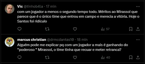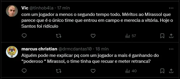 “Empate tosco, estava ganhando e entregou de forma ridícula com um a mais. Sote nossa que a campanha é boa e liderança isolada do grupo, agora torcer para ganhar do São Paulo“, disse um santista.