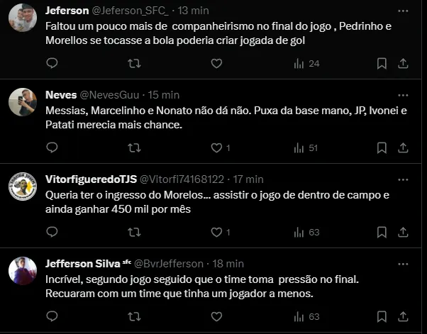 Nas redes sociais, os torcedores do Santos marcaram presença após o apito final. Comentaram no perfil oficial do clube. Boa parte da torcida não gostou do que viu na noite desta quinta-feira.