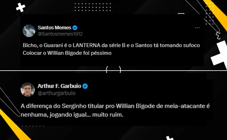 “Willian Bigode numa partida BISONHA. Serginho teve atuações ridículas. Eles podem ser péssimos à vontade, só não pode dar chance pra um garoto da base, aí eles não estão preparados”, disse um internauta.