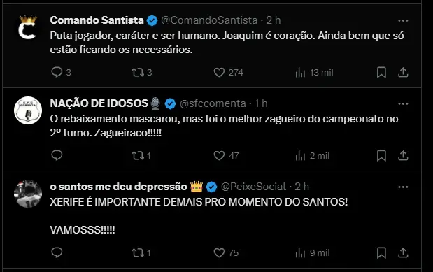“Ótima decisão Joaquim, nós santistas não esqueceremos. Vamos subir juntos“, disse um santista na publicação da equipe. Até o momento, a torcida elogia as contratações e permanências de outros jogadores.