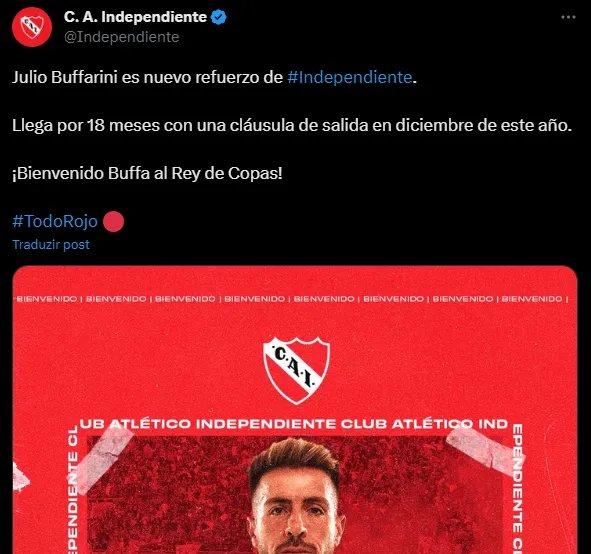 O jogador acabou sendo anunciado pelo Independiente (ARG), clube que é o maior campeão da Libertadores: sete conquistas (1964, 1965, 1972, 1973, 1974, 1975, 1984). Buffarini estava no Talleres também da Argentina, e agora chega no Rei de Copas após disputar 22 jogos pelo antigo clube.