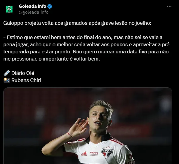 Nesse planejamento, está prevista a volta do meia Galoppo, que está se recuperando de uma ruptura no ligamento do joelho sofrida ainda no Campeonato Paulista, durante a semifinal contra o Água Santa, em duelo no Allianz Parque. Em entrevista ao Diário Olé, o argentino falou sobre quando voltará a jogar no Tricolor.