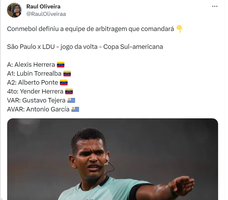 Recentemente, o São Paulo reclamou para CBF da arbitragem em partida contra o Flamengo, pelo Brasileirão. O árbitro Raphael Claus na oportunidade marcou um pênalti para o Mengão, que gerou revolta no time do Morumbi. Agora, o Tricolor Paulista espera que não ocorra erros da arbitragem para o jogo contra a LDU.