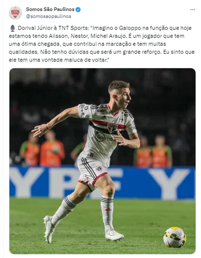 Dorival concedeu entrevista para a TNT Sports e expôs os planos para o meia argentino. “Acho que (Galoppo) será um grande reforço. Um garoto que promete muito, que vinha realmente um encaixe muito bom na equipe. Isso tudo foi passado pelos demais integrantes, próprio Muricy e Milton Cruz. Sinto uma vontade maluca dele de estar voltando”.
