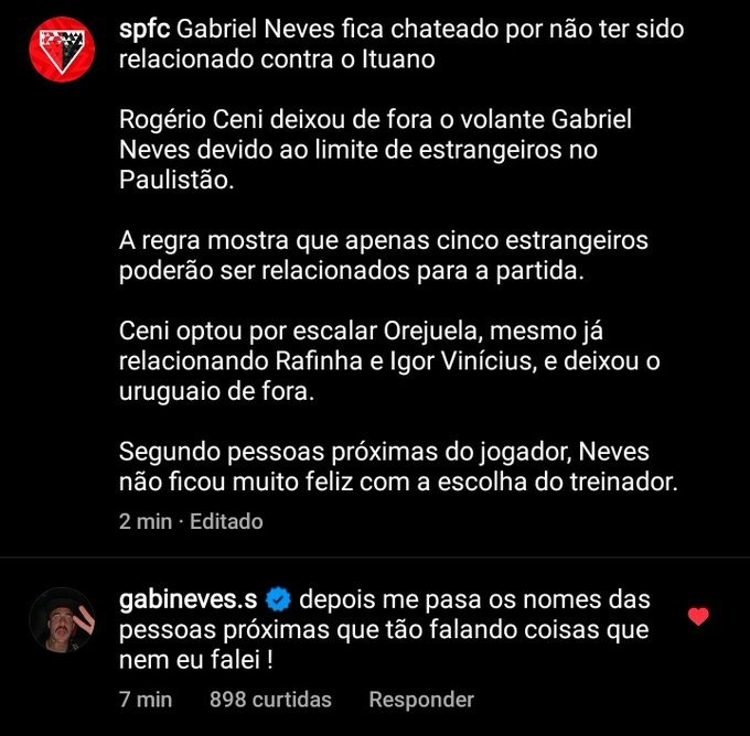 Nesta quarta-feira (18), Gabriel Neves apareceu nas redes sociais para desmentir a possível polêmica. Uma postagem realizada por um perfil de informações do São Paulo dizia que, de acordo com pessoas próximas ao atleta, o volante teria ficado chateado por não ter participado da partida. Neves, por sua vez, não gostou nem um pouco da afirmação. “Depois me passa os nomes das pessoas próximas que estão falando coisas que nem eu falei“, disse o atleta no Instagram.Confira a imagem abaixo.