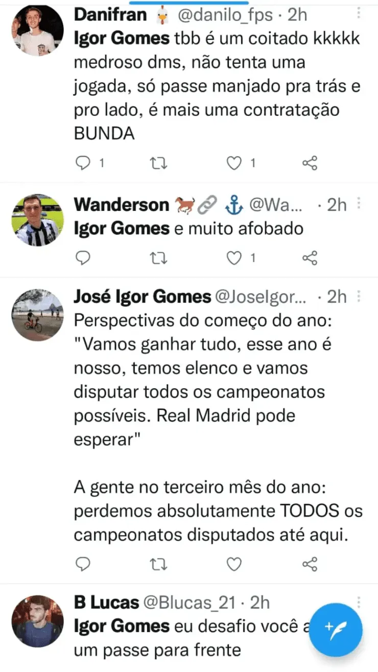 “Igor Gomes também é um coitado. Medroso demais, não tenta uma jogada. Só passe manjado para trás e pro lado, é uma contratação bunda”, escreveu um torcedor insatisfeito no Twitter. “Igor Gomes eu desafio você a dar um passe para frente”, brincou outro, visivelmente irritado com a atuação do meia contra o Millionarios.