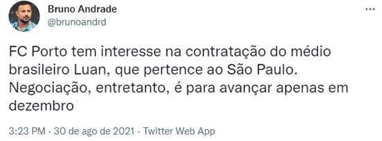 A poucas horas do fim da janela de transferências, o São Paulo recebeu uma sondagem do Porto pelo volante Luan, titular no time de Hernán Crespo que foi decisivo ao abrir o placar na final do Campeonato Paulista, diante do Palmeiras. O negócio, porém, só deve ser feito em janeiro. A informação é dos repórteres Brunno Carvalho e Bruno Andrade, do portal UOL.