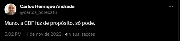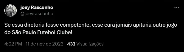 “Lá vem o palmeirense de novo”, “Só existe esse cara pra apitar?”, “Se essa diretoria fosse competente, esse cara jamais apitaria outro jogo do São Paulo Futebol Clube!” e “A CBF faz de propósito”, foram alguns comentários.