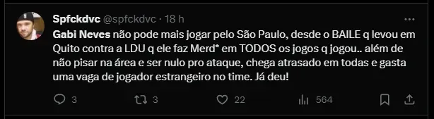 Visto com bons olhos pela maioria da torcida, Gabi Neves perdeu espaço e sofreu críticas após a expulsão. Nessa reta final da temporada de 2023, o volante não possui vaga garantida no elenco de Dorival Júnior.