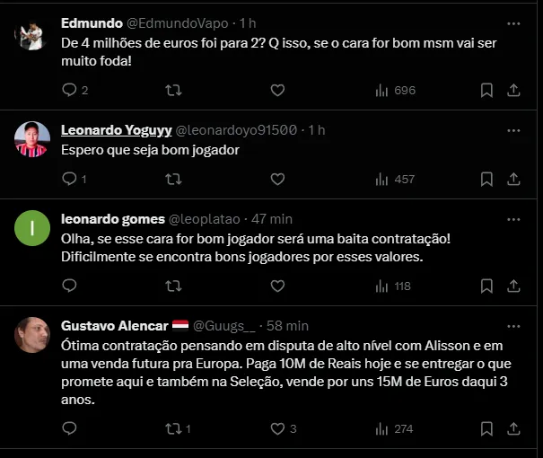 “QUE BAITA NEGÓCIO!! 10 milhões nele é pechincha, óbvio que pode dar certo e não pode dar. Mas indiscutivelmente é bom negócio“, comentou um torcedor. Além da contratação, a torcida elogia a forma de pagamento.