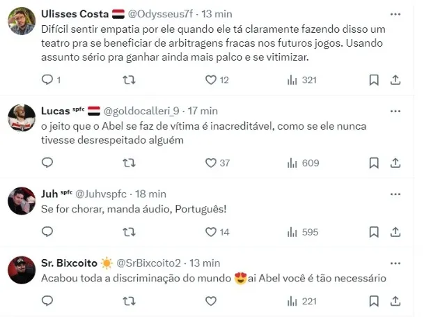 “No calor, ao final da partida, acabei proferindo uma frase inadequada”, argumentou Belmonte. “Portanto, peço desculpas ao técnico Abel Ferreira, ao Palmeiras, uma instituição importante do futebol brasileiro, e à comunidade portuguesa. Eu busca identificar o técnico ao árbitro, mas, de novo, repito, a frase foi inadequada e peço desculpas”, reforçou Belmonte.