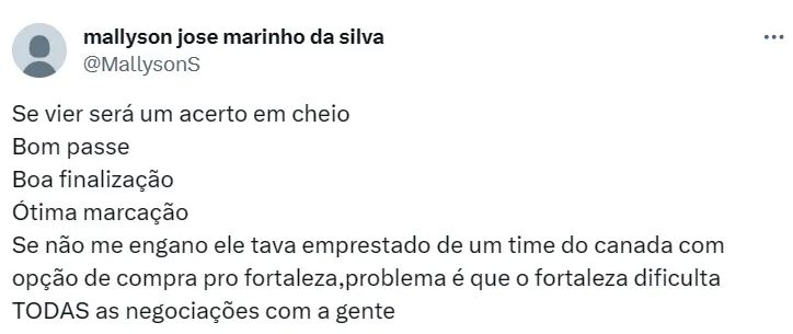 “Formalmente, para nós, não chegou nada. Nenhum momento chegou papel timbrado com proposta pelo Caio Alexandre. Houve um contato informal de uma pessoa ligada ao Palmeiras. Tem um tempinho, não foi ontem e nem semana passada. Trabalhamos com ele no Fortaleza”, disse Marcelo Paz, presidente do clube cearense.