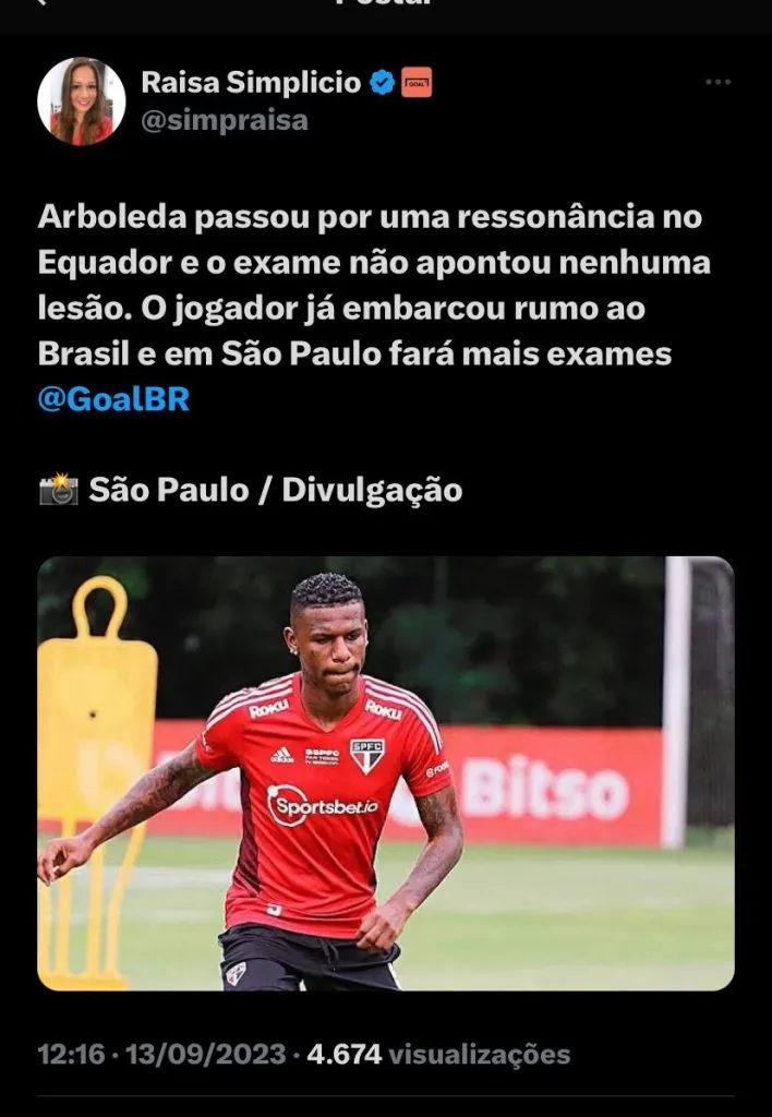 A jornalista Raisa Simplicio, do portal O Goal, trouxe à tona as últimas atualizações sobre a situação do jogador são-paulino. Segundo a comunicadora, Arboleda passou por ressonância no Equador, não apontou nenhuma lesão e ele já está embarcando para o Brasil, o São Paulo irá fazer mais exames.