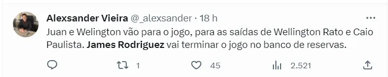 Ainda conforme a informação trazida pelo jornalista em um vídeo publicado em seu canal no YouTube, Nicola explicou que ele deve ganhar espaço na partida do São Paulo no meio de semana pela Série A do Campeonato Brasileiro, mas para o jogo de volta da final ele deve seguir entre os reservas. Outros nomes estão na frente do colombiano na lista de Dorival.