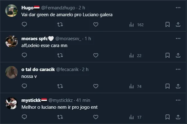 Não à toa, ao descobrirem que ele apitará a partida contra o Clube Celeste, vários são-paulinos foram às redes sociais se manifestar. Aliás, um tema recorrente foi a previsão de que Luciano teria tudo para receber um cartão amarelo.