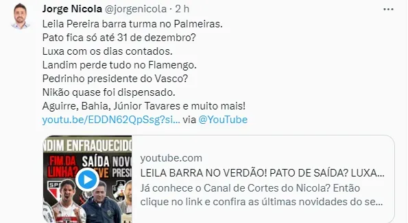 “O São Paulo quer ter uma avaliação mais precisa do que o Pato e o que outros jogadores serão capazes para montar o planejamento para 2024. É importante lembrar que a final da Copa do Brasil tem impacto direto em 2024. Se o São Paulo for campeão embolsa R$ 70 milhões e garante vaga na Copa Libertadores da América”, informou Nicola.