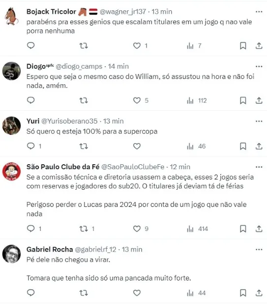 “Se a comissão técnica e diretoria usassem a cabeça, esses 2 jogos seria com reservas e jogadores do sub20. O titulares já deviam tá de férias Perigoso perder o Lucas para 2024 por conta de um jogo que não vale nada”, criticou um torcedor do São Paulo.