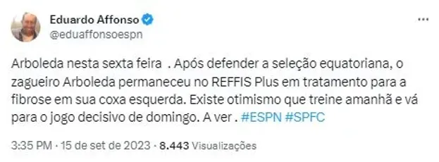 Isso porque as dores estão incomodando de maneira considerável o jogador. Arboleda treinou com o restante do elenco nesta sexta-feira (15), justamente porque ainda é dúvida e o departamento médico do Clube, que decidiu não descartar a escalação do zagueiro e traça o plano para tentar solucionar a situação até domingo.