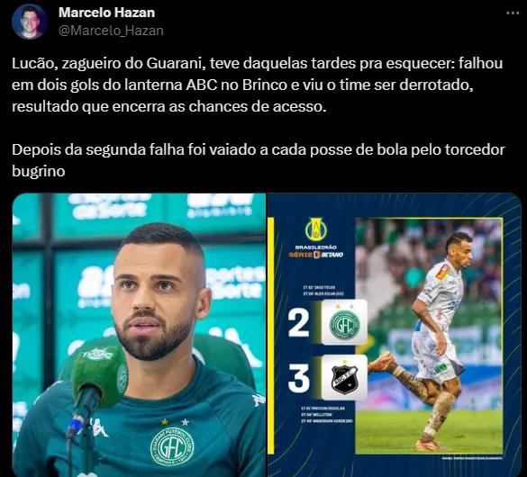 A partir desta segunda falha, Lucão começou a ser vaiado pela torcida do Guarani presente no estádio a cada toque na bola. Em 2023, o zagueiro tem 48 jogos e uma assistência com a camisa do Bugre.