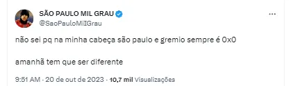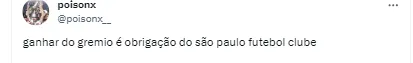 É verdade que os últimos sete confrontos na capital paulista, seis terminaram em empates entre as equipes, mas no último duelo, no Morumbi, o São Paulo saiu vencedor por 2 a 1, com gols de Vitor Bueno e Igor Gomes, que já não defendem mais o time. Porém, nos últimos dois jogos entre os times, o Grêmio venceu (dois na Arena), o último por 2 a 1 com gols de Cristaldo e Reinaldo, e Calleri para o time paulista, e no duelo anterior a equipe gaúcha venceu por 3 a 0, com gols de Thiago Santos, Diogo Barbosa e Jhonata Robert.