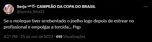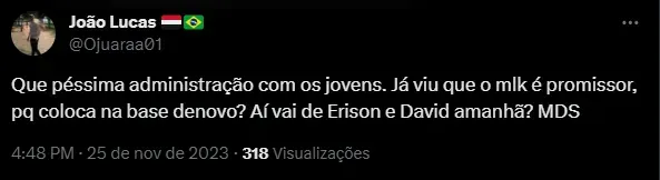 “Que péssima administração com os jovens. Já viu que é promissor, porque coloca na base?”, “Se o moleque tiver arrebentado o joelho logo depois de estrear no profissional e empolgar a torcida…”, foram alguns comentários.
