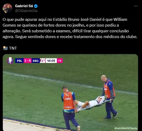 A joia são-paulina, que entrou na segunda etapa contra o Fluminense, pelo Campeonato Brasileiro, preocupou a torcida do São Paulo. Isso porque ele saiu da partida do Sub-20 de maca, sentindo fortes dores no joelho.