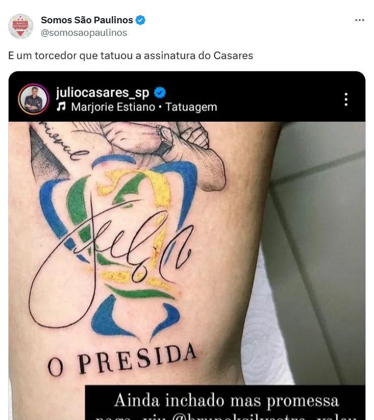 A foto da tatuagem foi compartilhada pelo próprio Casares em seu Instagram. “E não é que o talentoso São-paulino @barrigudinhotricolor tatuou minha assinatura no corpo. Ela assina o troféu conquista pela Copa do Brasil. Pai do céu!!! Sem palavras. Agradeço muito pela homenagem. Seguimos sempre”, escreveu o presidente.