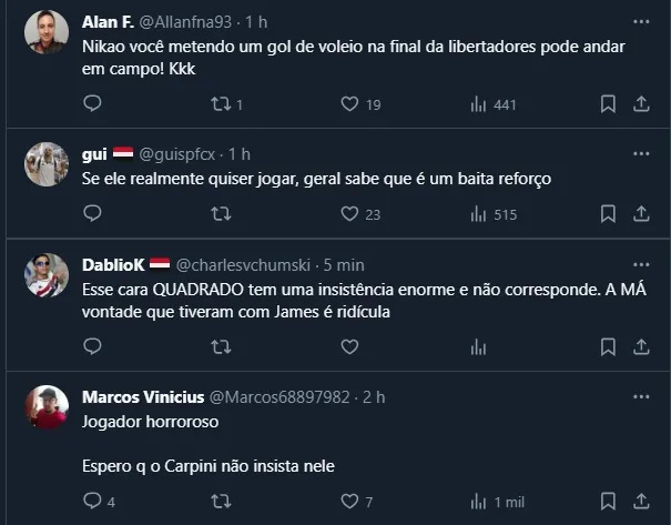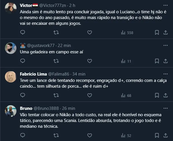 Desse modo, mesmo com a confiança de Carpini e o notório crescimento em campo, Nikão ainda vem causando polêmica nas redes sociais, já que os torcedores se dividem sobre sua utilidade.