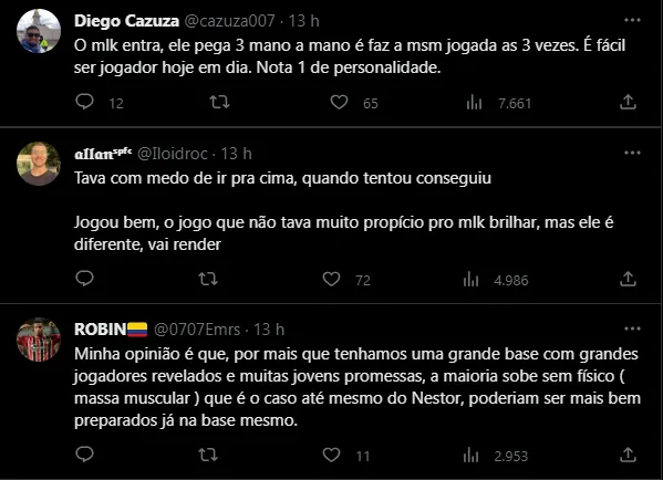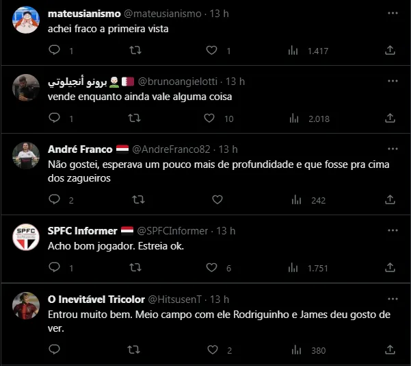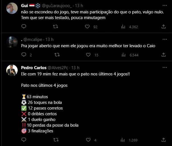 Ao todo, o camisa 47 esteve em campo por cerca de 19 minutos, tendo dado 12 passes certos, um drible certo e recuperado uma vez a posse da bola. O jovem de 21 anos foi bastante participativo e recebeu muitos elogios dos torcedores nas redes sociais. Inclusive, até mesmo uma comparação com Alexandre Pato foi feita, já que o ex-Milan (ITA) pouco tem atuado em 2023. Confira alguns comentários sobre a estreia de Pedrinho: