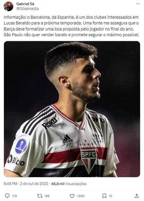 Na publicação do jornalista, fica claro que o Barcelona estuda a possibilidade de formalizar uma oferta oficial apenas no fim de 2023. O São Paulo, por outro lado, está disposto a dificultar a venda do atleta, com a intenção de valorizar ao máximo o passe de Lucas Beraldo. Os jornais espanhóis destacam a temporada do jogador há alguns meses, com direito a comparações com a recente revelação Éder Militão. Mais uma joia nasceu em Cotia e Julio Casares não pretende perder dinheiro.