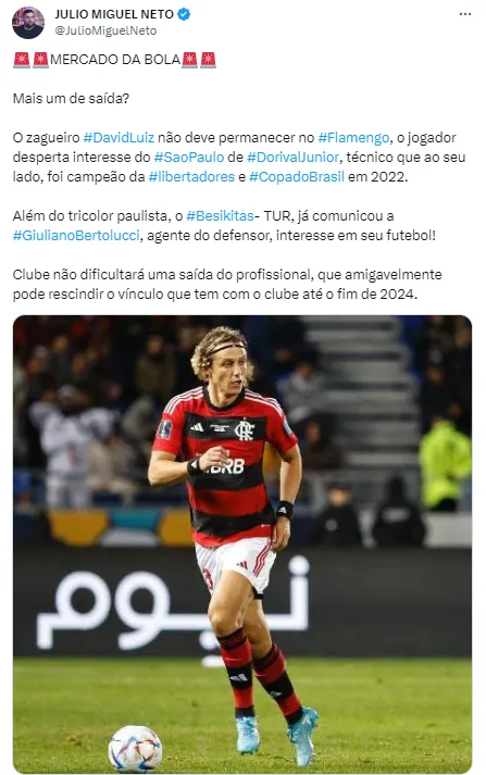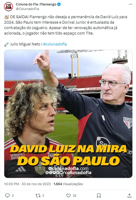 Primeiro que o Tricolor deve receber assédio na janela de transferência após o título nacional do time paulista. Além disso, o clube também começa a olhar as opções no mercado para fortalecer o elenco do Soberano. Uma opção é o zagueiro David Luiz, de 36 anos.