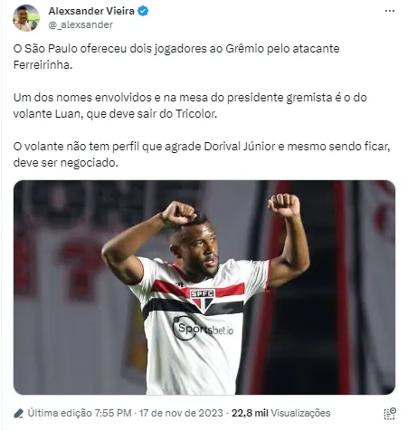 Após o atacante do Grêmio ficar próximo do São Paulo, segundo o jornalista André Hernan, o Grêmio pode não liberar mais o atleta. A explicação para isso se deve ao fato do Tricolor Gaúcho não ficar satisfeito com as condições impostas pelo clube do Morumbi.