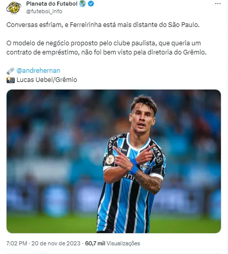 De acordo com o André Hernan, o São Paulo gostaria de um contrato por empréstimo para ter Ferreirinha, o que foi esfriando as tratativas por parte do Grêmio. Com a postura do Tricolor Gaúcho agora, o negócio é visto com maior dificuldade de seguir.