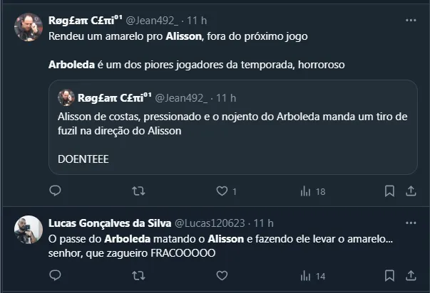 Dito isso, além de ter sido amplamente questionado pelo lance do gol do Cuiabá, em que ele perde a disputa para o atacante Isidro Pitta, Arboleda foi apontado como o grande responsável pela suspensão de Alisson.