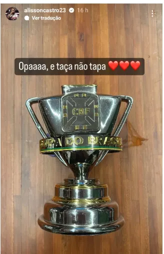 Alisson então, foi até as redes sociais provocar Romero. Com uma foto da taça da Copa do Brasil, Alisson escreveu na legenda, com uma indireta ao corintiano: “Opa, é taça, não tapa”. Na web os torcedores são paulinos também não deixaram barato, e houve comentários do tipo: “Esse tal de Romeiro não serve nem para limpar a chuteira do Alishsow”, enquanto outro escreveu, “Eu te venero, Alisson KKKKKK….”. Veja a publicação de Alisson abaixo.
