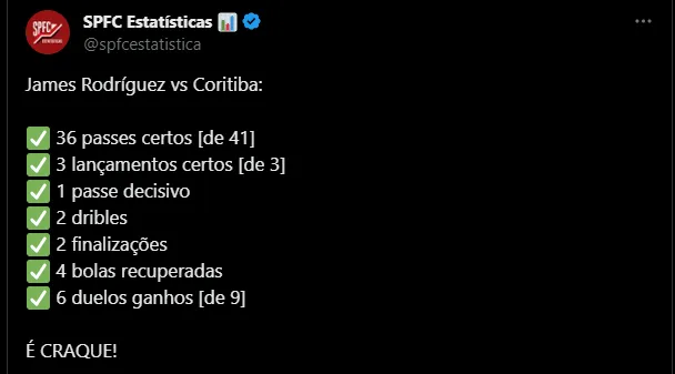 Dentro das quatro linhas, um dos jogadores que começou atuando foi o colombiano James Rodríguez, contratado como grande estrela e que até aqui pouco mostrou. Claramente em outra rotação física, o camisa 19 sequer foi utilizado nas finais da Copa do Brasil, mas vem se provando um jogador importante para determinados jogos. Por mais que tenha tido um gol anulado logo no início, foi dele a cobrança de falta que resultou no gol de Alan Franco.