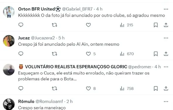 “Quando Bruno Lage saiu e tomou-se a decisão de colocar Lucio Flavio, um nome que sempre agradou foi o de Hernán Crespo, que passou pelo São Paulo, foi campeão paulista e recentemente deixou o Al-Duhail, do Catar”, explicou o jornalista.