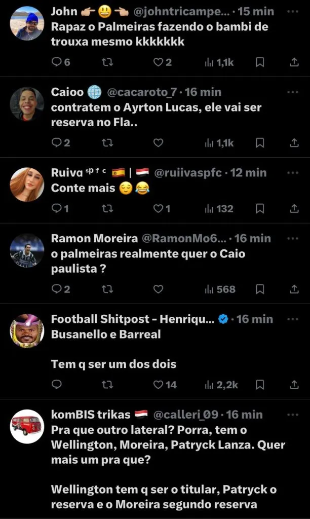 “São Paulo começa observar nomes de laterais esquerdos que já estavam na lista do departamento de análise e mercado. Outro fator importante: SP estava estudando emprestar o Lateral Moreira mas agora o cenário deve mudar”, escreveu Hernan.