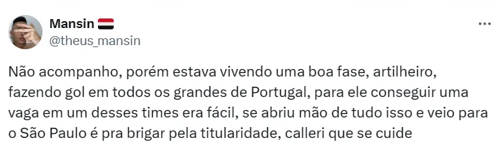 Ainda que seja considerado um titular absoluto, Calleri precisava de uma ‘sombra’ e é nisso que a diretoria está focada no momento. Com André Silva acertado, outras sondagens no mercado foram paralisadas por ora.