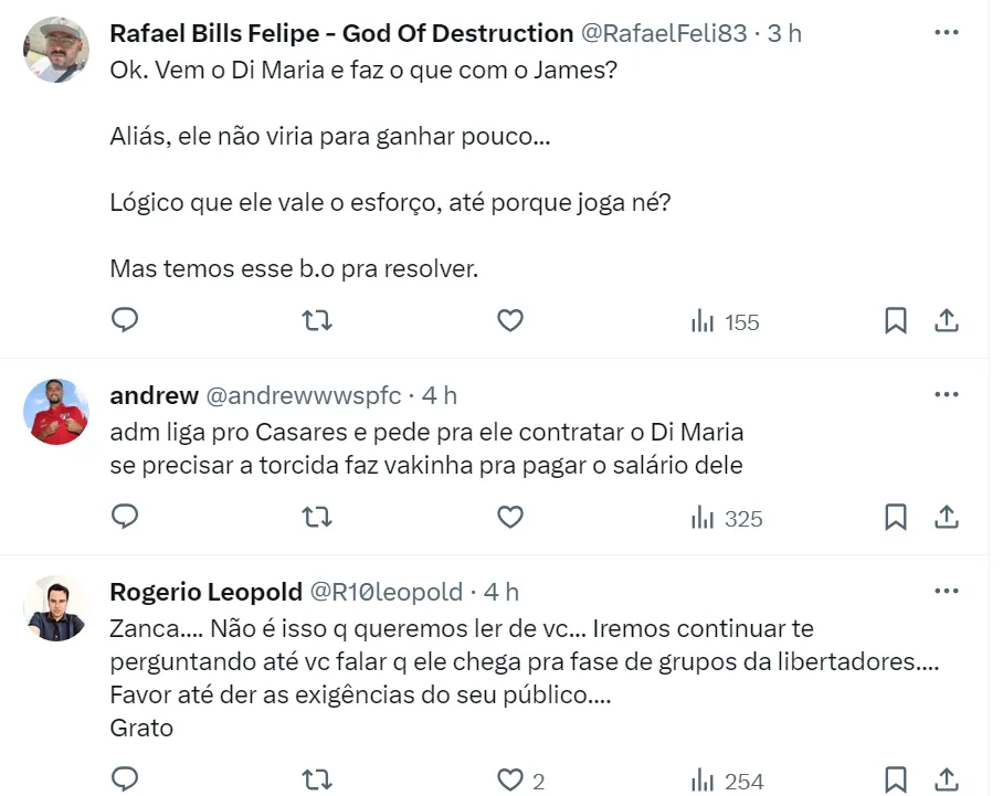 No entanto, o portal Blog do São Paulo descartou a possibilidade de Di María ser contratado pelo Clube Paulista: “Além de não vir nesta janela, não há planos para vir no meio do ano”, diz a reportagem.