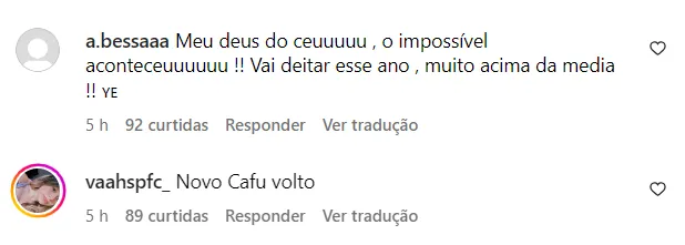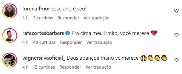 Um deles foi o ídolo são-paulino, Lucas Moura. O jogador escreveu: “Chegou a hora da colheita. Bom retorno irmão. DEUS abençoe”. Outro, foi o zagueiro são-paulino Alan Franco.