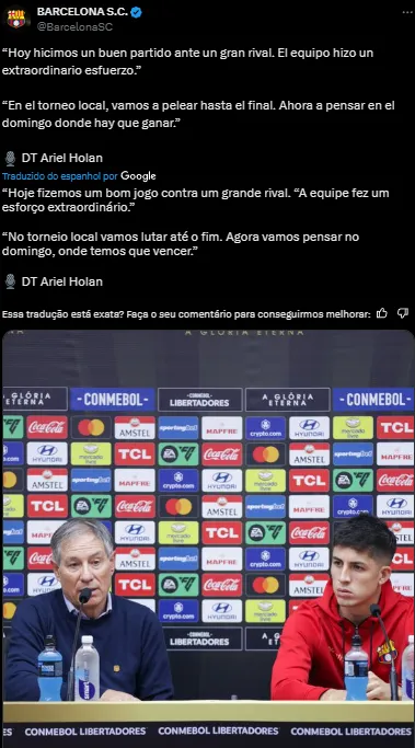 Após o jogo, o treinador do Barcelona, do Equador, Ariel Holan, conhecido no futebol brasileiro por um trabalho no Santos, exaltou a partida do seu time contra o Tricolor Paulista mesmo atuando fora de seus domínios.